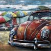 Handgemaakt metalen 3-D schilderij van een Volkswagenbusje bij het strand.