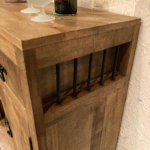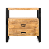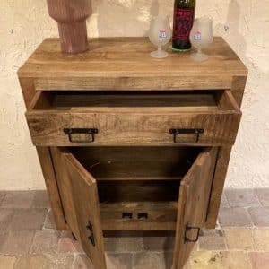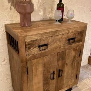 Leuke bar/trolley kast op wieltjes, Mangohout gecombineerd met zwart staal, voorzien van 1 lade en 2 deurtjes. Het mangohout is afgelakt met blanke lak, een ware eyecatcher, past perfect in elk interieur!