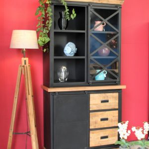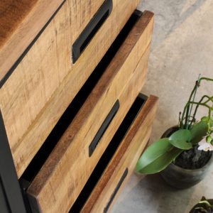 De buffetkast iron mango black is perfect voor iemand die van een industrieel design houdt. Het frame van deze kast is van zwart staal, en de lades en lijsten zijn van mangohout. De stoere, robuuste meubels zijn allemaal blikvangers en ook nog eens makkelijk te combineren. Deze serie bestaat uit een buffetkast, dressoir en tv meubels in verschillende afmetingen.