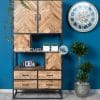 Dit prachtige Industriële dressoir van Mango hout gecombineerd met zwart staal, is voorzien van 6 lades en 2 schuifdeuren. Het mangohout is afgelakt met blanke lak, een ware eyecatcher, past perfect in elk interieur!
