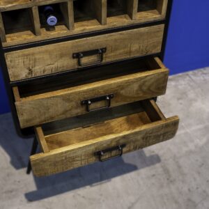 Met zijn stalen frame en houten leggers een stoere aanvulling in je interieur! Dit opberg meubel is heel handig. Je bewaart er gemakkelijk je mooiste flessen drank in. Wijnglazen kun je hangen boven het middenblad waar je als een echte bartender drankjes voor je gasten klaar maakt.