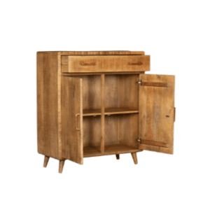 Kabinet Omaha is volledig uitgevoerd in mangohout. Dit model is voorzien van één lade en twee deuren. De ladenkast is ingelegd met verschillende stroken gelakt hout, waar het meubel zijn eigentijdse karakter aan te danken heeft.