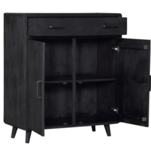 Kabinet Omaha Black is volledig uitgevoerd in mangohout. Dit model is voorzien van één lade en twee deuren. De ladenkast is ingelegd met verschillende stroken hout, waar het meubel zijn eigentijdse karakter aan te danken heeft.