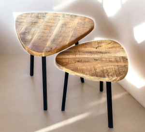 Deze leuke salontafelset is gemaakt van mangohout en heeft zwarte metalen pootjes, de dikte van het blad is +- 2,8 cm.