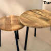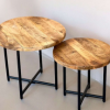 Deze leuke salontafelset is gemaakt van mangohout en heeft zwarte metalen pootjes, de dikte van het blad is +- 2,8 cm.
