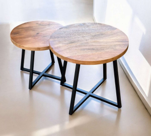 Deze leuke salontafelset is gemaakt van mangohout en heeft zwarte metalen pootjes, de dikte van het blad is +- 2,8 cm.