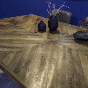 Het chique visgraatpatroon geeft deze tafel een luxueuze warme uitstraling, hierdoor gegarandeerd een stijlvolle blikvanger in jouw eetkamer! Het mangohout op het bovenblad is volledig verlijmd op de onderlaag, en heeft geen kieren of spleten waar vocht of kruimels tussen gaan zitten, wel zijn de meeste bladen licht golvend, met een totale bladdikte van 3,5 cm. En gecombineerd met een zwart stalen onderstel.