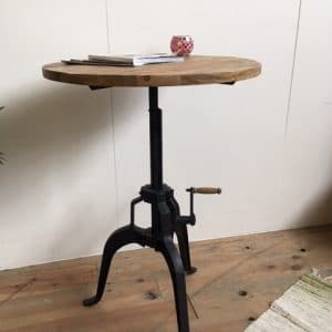 Mooie industriële opdraaitafel met gietijzeren frame en afgelakt Mangohouten blad.