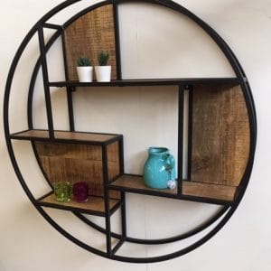 Industrieel wandrek met een diameter van 100 cm en totale diepte van 16 cm, gemaakt van afgelakt Mangohout met een zwart stalen frame.
