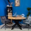 Zie deze leuke ronde salontafel van Mangohout, gecombineerd met een zwarte stalen poot. Het mangohout is afgelakt met blanke lak, een ware eyecatcher, past perfect in elk interieur!