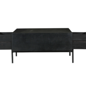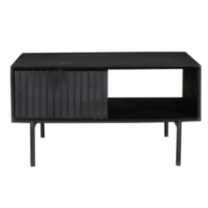 Deze salontafel uit de Madison serie is gemaakt van mangohout. De metalen poten zijn afgewerkt met een zwarte lak. Dit model is voorzien van twee lades en één open vak. De lades zijn voorzien van een verticaal lattenpatroon en is afgewerkt met een zwarte lak.