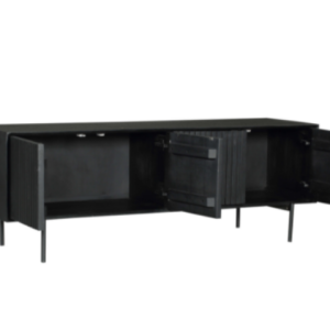Dit Tv meubel uit de ‘Madison’ serie is gemaakt van mangohout. Het metalen frame is afgewerkt met een zwarte lak. Dit model is voorzien van vier deuren. De deuren zijn voorzien van een verticaal lattenpatroon en is afgewerkt met een zwarte lak.